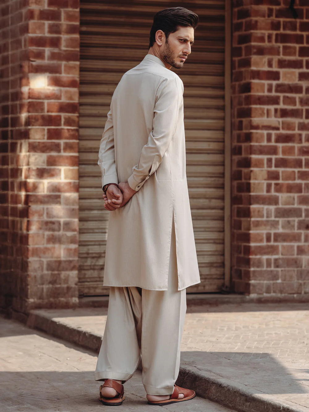 Crafted from soft, breathable fabric, this kameez shalwar ensures all-day comfort while maintaining a graceful structure. The neutral beige tone offers versatile styling, making it suitable for daily wear, Jumma prayers, festive occasions, or formal gatherings.