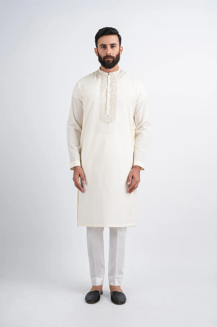 Elevate your traditional style with the Men’s Embroidered Kurta Pajama Set, now available at Nevix.pk. Designed in a graceful off-white tone with fine embroidery on the neckline, this outfit blends timeless tradition with modern elegance.